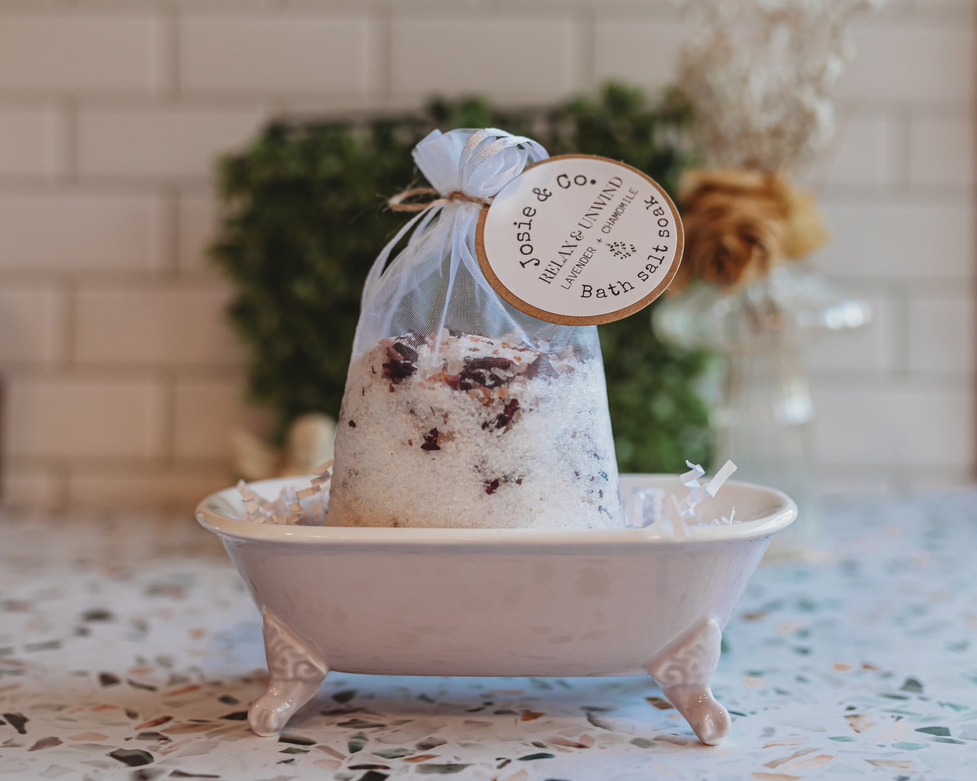 Unwind effortlessly with our homemade bath salt soaks, now available in convenient single-use bags.