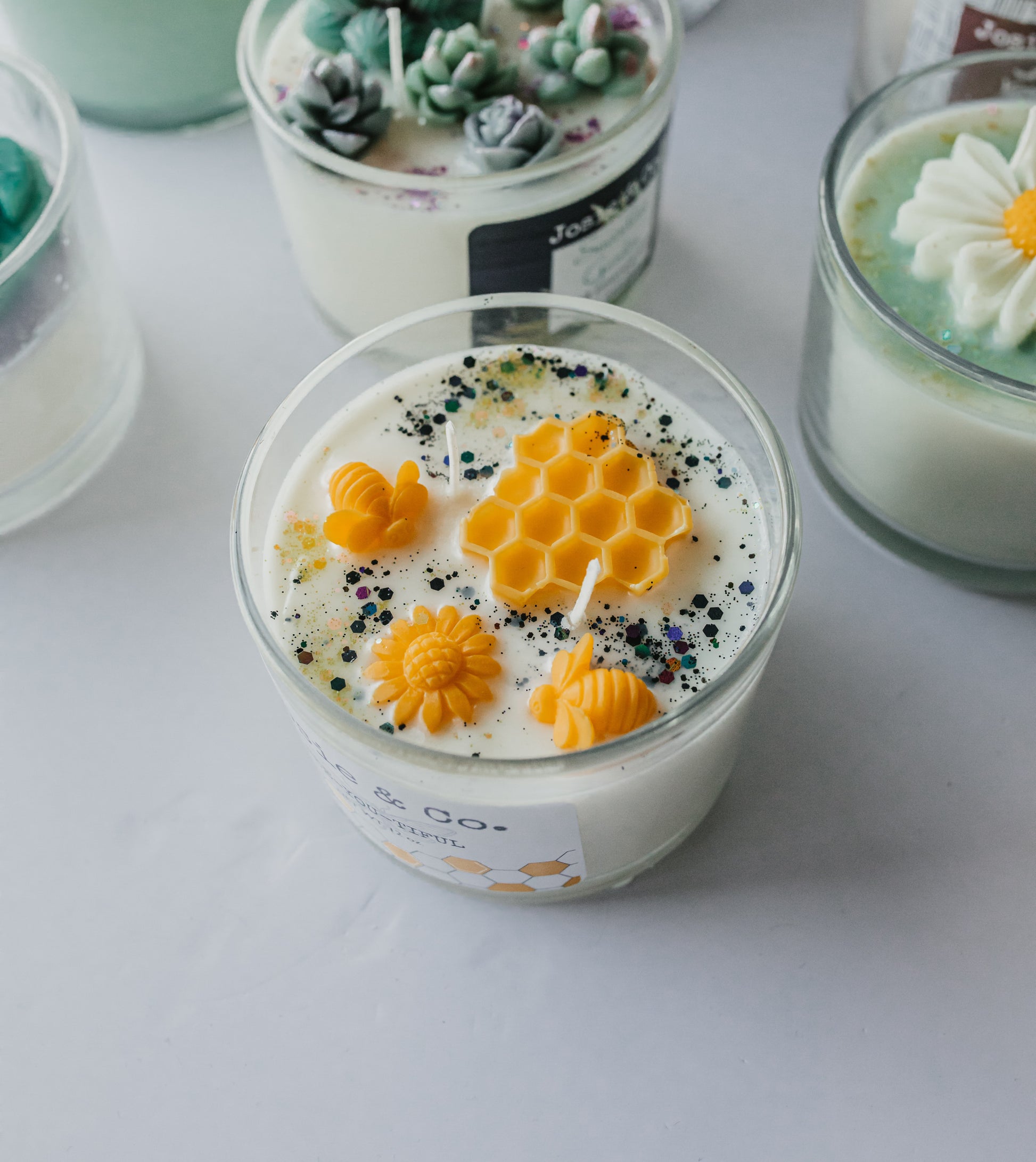 This handcrafted soy wax candle features detailed wax embeds of honey bees, honeycomb, and sunflowers. Infused with clean, toxin-free layered scents of sweet honey & shea and a tropical Hawaiian blend, it’s both visually stunning and delightfully fragrant—a perfect gift or decorative accent.