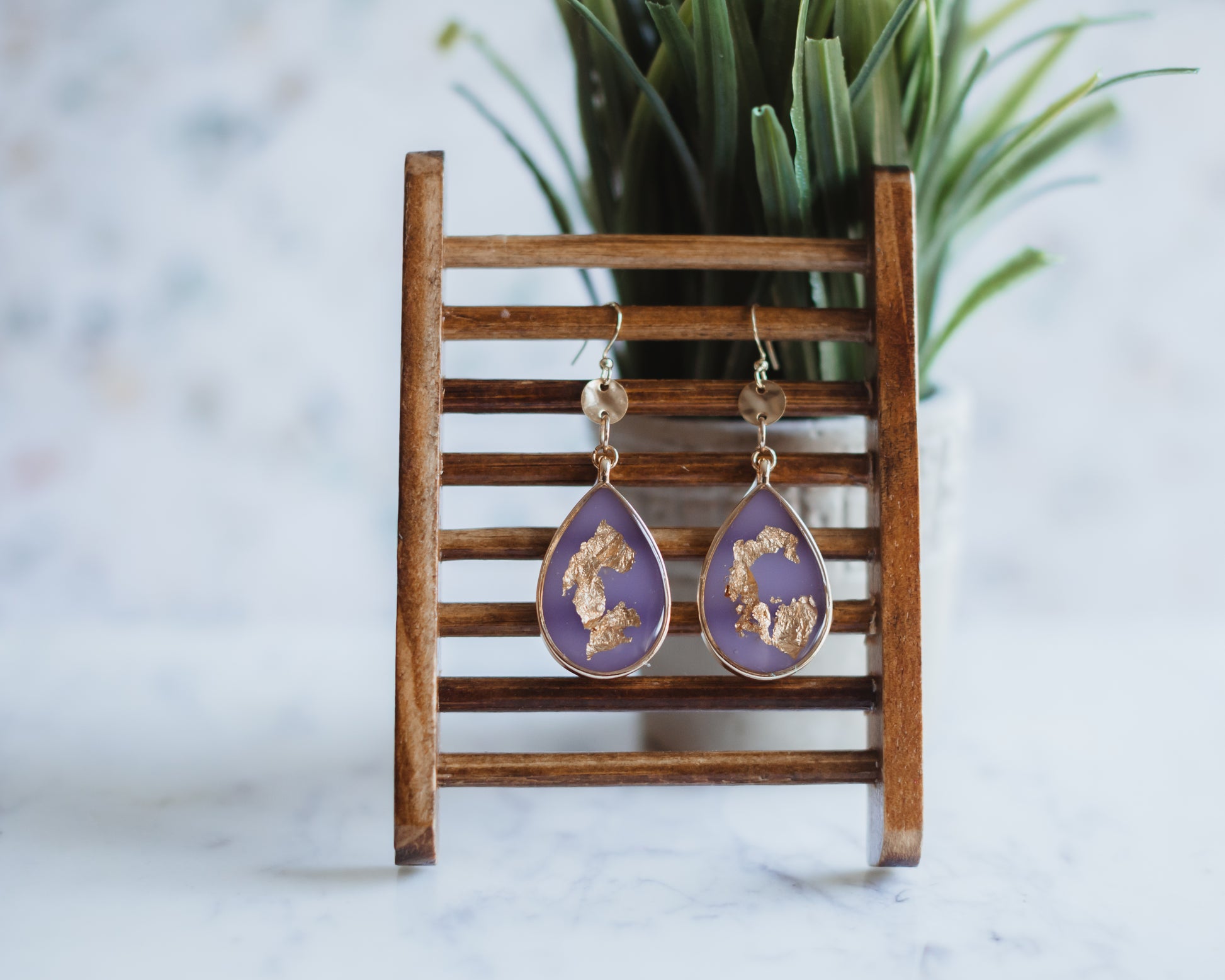 These deep purple teardrop earrings drip with mood and mystery, each one laced with gold flakes that catch the light like fire in the dark. Suspended in a sleek gold bezel, they strike the perfect balance between elegance and edge.