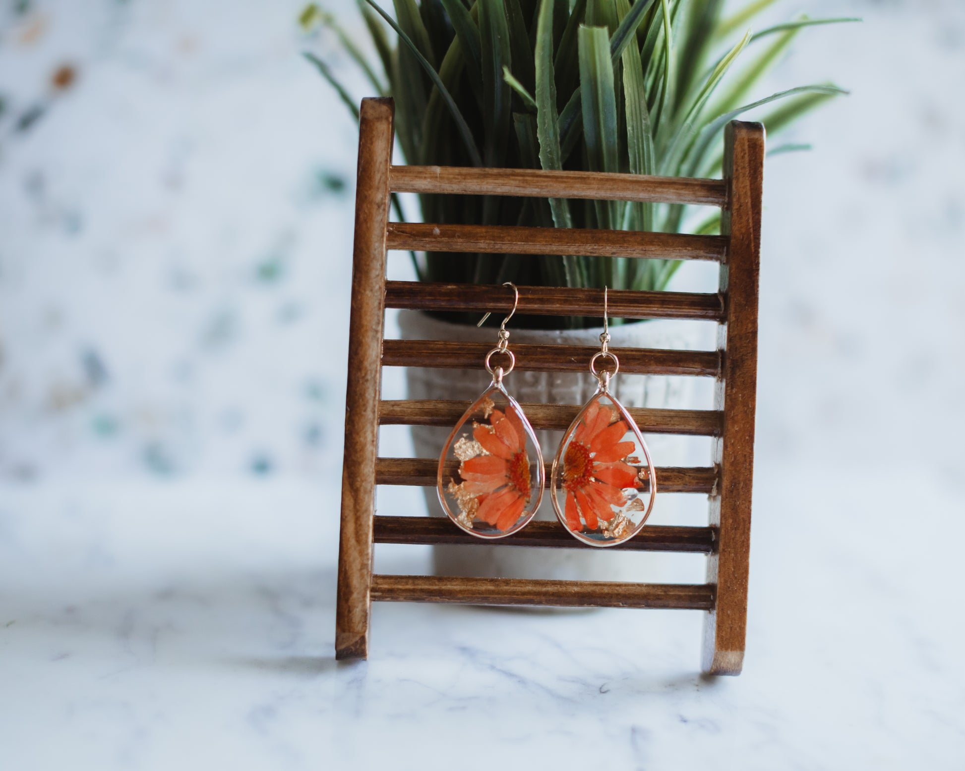 These vibrant orange floral earrings channel sunflower energy with daisy details—bright, fierce, and impossible to ignore. Encased in clear resin and flecked with real gold flakes, each bloom glows like golden hour trapped in time. Framed in a gold bezel, they radiate power, not prettiness.